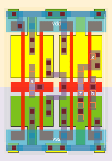 Single stage 2-I/P NOR gates with one inverted input. The output P:N ratio is about 0.75 and the stage effort on pin