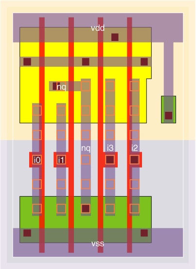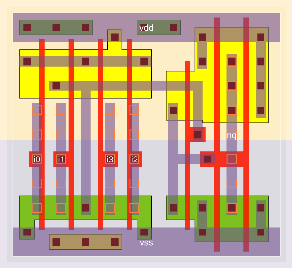 The noa2a22_x1 is a single stage AND-OR-Invert with P/N ratio of 1.7. The noa2a22_x4 is a 3 stage AND-OR-Invert with stage efforts of about 1.7 and 3.9.