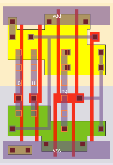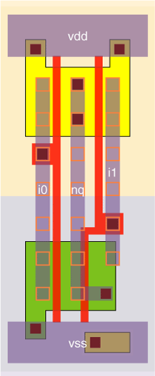The na2_x1 is a single stage 2-NAND with P/N ratio of 1.7. The na2_x4 is a 3 stage 2-NAND with stage efforts of about 0.9 and 3.9.