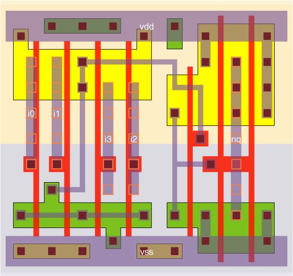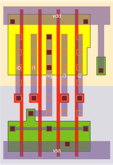 The nao2o22_x1 is a single stage OR-AND-Invert with P/N ratio of 1.7. The nao2o22_x4 is a 3 stage OR-AND-Invert with stage efforts of about 1.7 and 3.9.