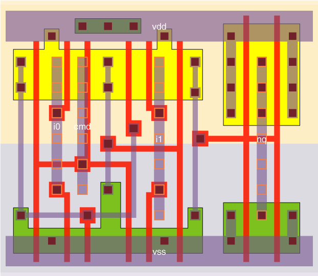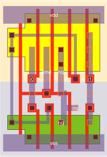 The nmx2_x1 is a single stage inverting mux with a P/N ratio of 1.7. The control signal cmd can be 1 or 2 delay stages with a stage effort of about 2. The nmx2_x4 is a 3 stage inverting mux with stage efforts of about 1.7 and 3.9. The control signal cmd can have 3 or 4 stages with stage efforts of about 1, 1.7 and 3.9. |