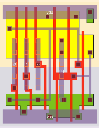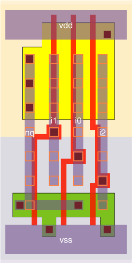 The no3_x1 is a single stage 3-NOR with P/N ratio of 1.5. The no3_x4 is a 3 stage 3-NOR with stage efforts of about 1.2 and 3.9.