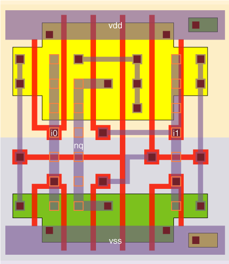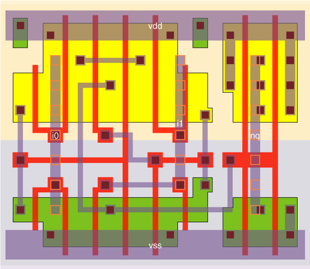 2 XNOR gates designed with an AND-OR Invert gate and 2 input inverters. The nxr2_x4 then has a large output inverter to drive the output. The nxr2_x1 is a 1/2 stage 2-XNOR, and the nxr2_x4 is a 2/3 stage 2-XNOR. Stage efforts are about 2 for the inverter driving the AND-OR-Invert, and 3.5 driving the output inverter. |