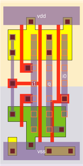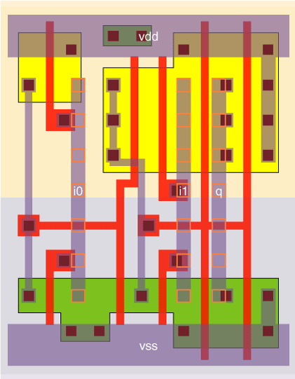 The on12_x1 is a single stage 2-NAND with one inverted input having a stage effort of about 1.3 and output P/N ratio of 1.7. The on12_x4 is a 2-NOR with an inverted input driving an output inverter, with stage efforts of about 1.3 and 4.4 and output P/N ratio of 2. |