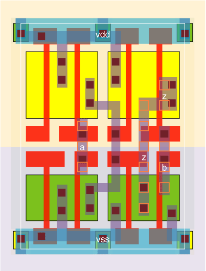 Single stage 2-I/P NOR gates with one inverted input. The output P:N ratio is about 0.77 and the stage effort on pin