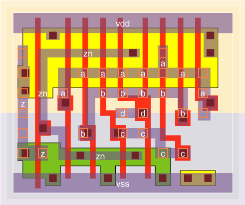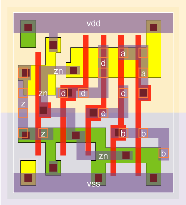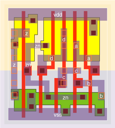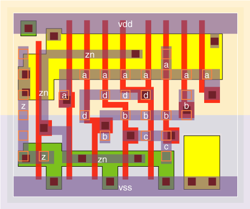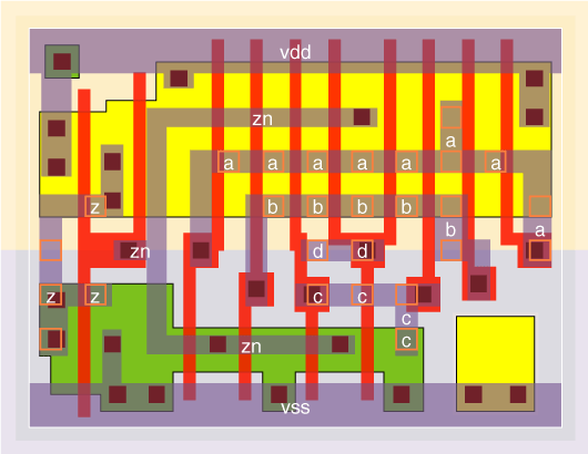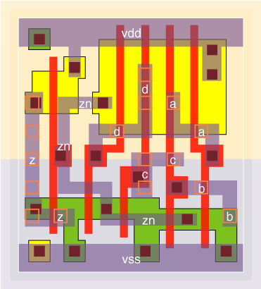 4 I/P OR gates designed with large (v0 version), medium (v3 version) and small (v4 version) input stages. The stage effort is 1.9 for the or4v0x05, 2.2 for the or4v0x1, 2.6 for the or4v0x2, 3.3 for the or4v3x2, 2.8 for the or4v0x3 and 4.0 for the or4v4x05. The v0 cells are optimised for speed with typical wireload values, while the v4 cell is optimised for a zero wireload capacitance. The v3 is designed to have a low Prop delay and high drive but still be small by using an unfolded input NOR gate. The P/N ratio is kept to about 2 except for the or4v3x2 NOR gate which has a P/N ratio of about 1. |