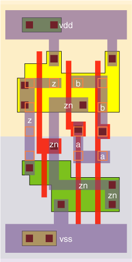 2 I/P AND gate designed with a large input stage. This reduces the delay, especially when the wire capacitance on the input pin is high. The stage effort is 1.2 for the an2_x05, 1.5 for the an2_x1 and 1.9 for the an2_x2.