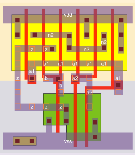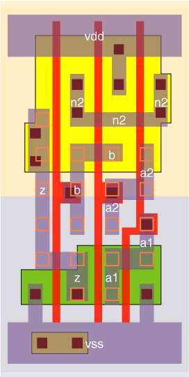 3 cells with different drive strengths, each with a P/N ratio of about 2. The width of the N-transistor connected to pin b is designed to have a similar conductivity to the two series N-transistors in order to maintain a consistent output drive capability. |
