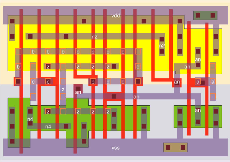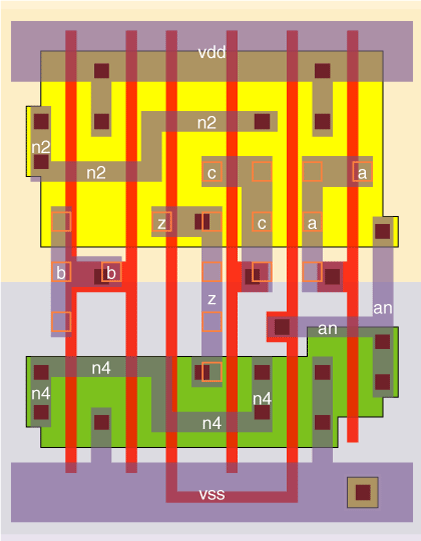 The output is the inverted carry of the inverse of pin a and pin b and carry input c, with the delay from pin c being favoured. The cells here use a P/N ratio of 2.