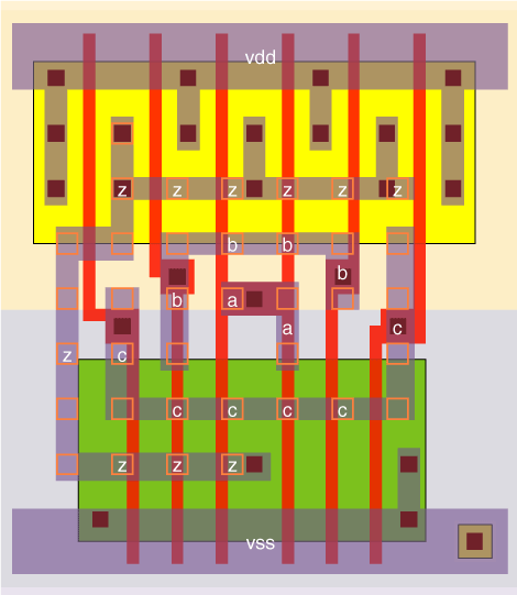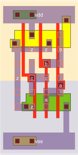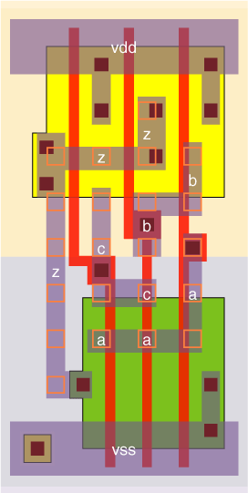 The P:N ratio is set to 2.33. The fastest speed occurs when the shape factor r=√(KP÷KN×µ). For a 3-NAND gate, KP=1; KN=7/3, and for µ=9/4, r=√(27/28). We chooose to set r=1 instead, so the P:N ratio is close to the maximum speed, as well as giving balanced rise and fall drive strengths, with the P and N transistors having the same size. |