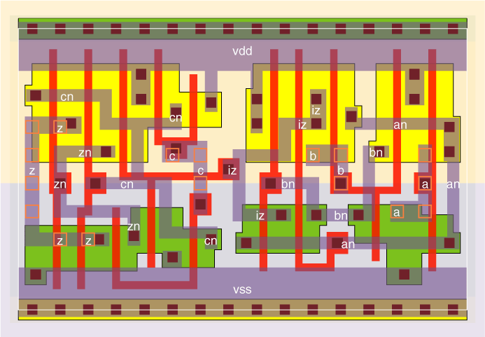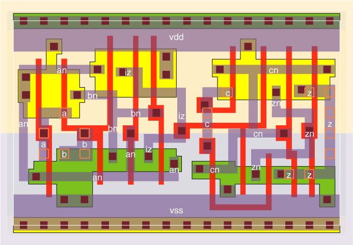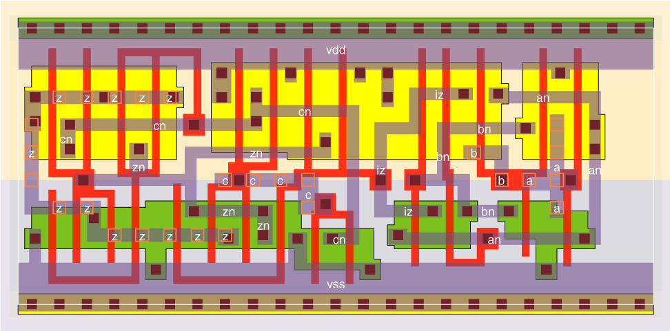 This configuration is faster and smaller than making the function with 3 series P and N transistors driving the output. The delay shown is from pin b, while pin c is the fastest input.