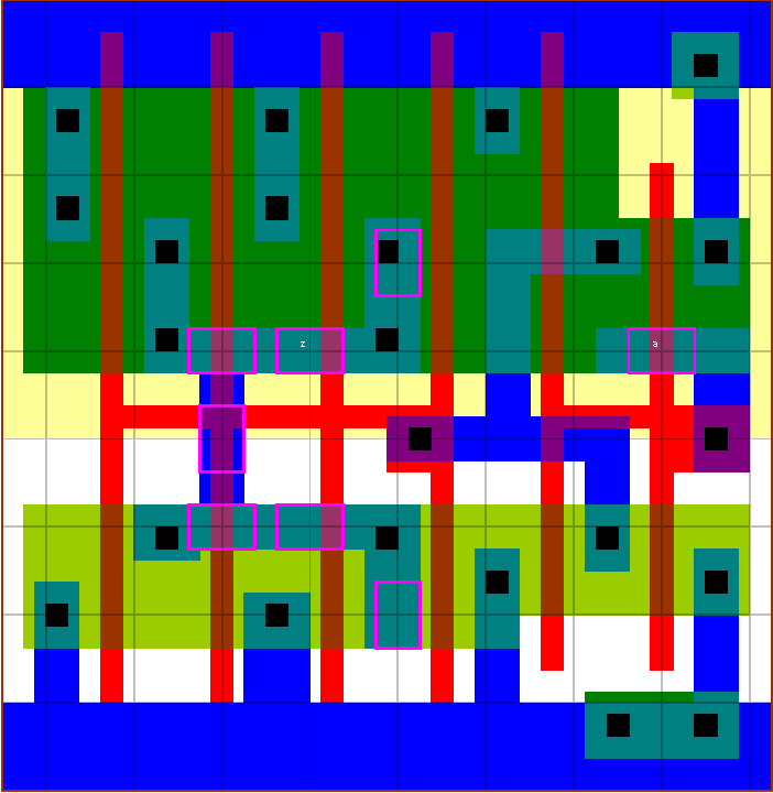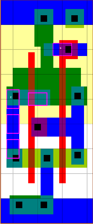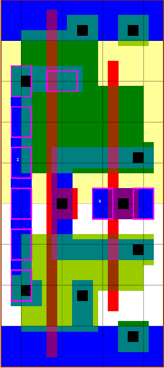 The buffers allow a large load to be driven with a small input capacitance. The delay cells have a large fixed delay and are mainly used for hold time fixing. The dly1 cell uses four chained inverters. The dly2 cells use two inverters with series transistors. The layout style maximises internal node parasitic capacitances, which contributes about 12ps to the dly1v0x05 fixed delay. The buffers have a P/N ratio of 2 (bf1v0), 1.5 (bf1v1) and 2.25 (bf1v2). The P/N ratio of 2 offers good output skew, while 1.5 is close to the fastest speed and 2.25 is balanced (if the mobility ratio = 2.25). The v0, v1, v2 & v5 versions have been designed for high speed, while the bf1v4x1 has been designed for minimum input capacitance. |