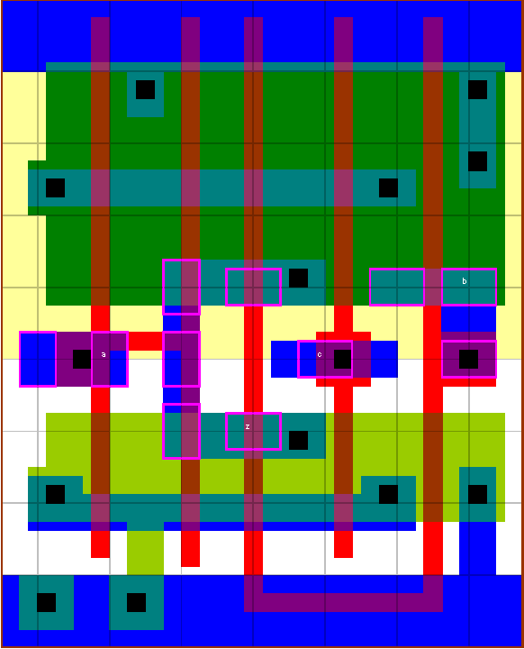The output is the inverted carry of bits a and b and carry input c, with the delay from pin c being favoured. The cells here use a P/N ratio of 2. |