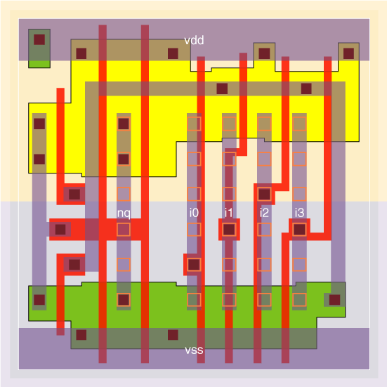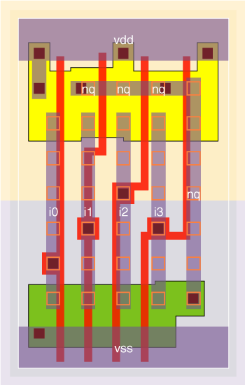 The na4_x1 is a single stage 4-NAND with P/N ratio of about 3. The na4_x4 is a 3 stage 4-NAND with stage efforts of about 1.2 and 3.9.