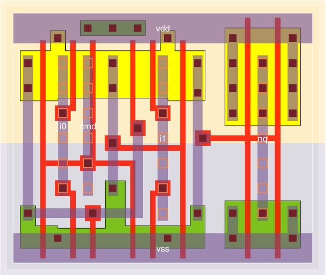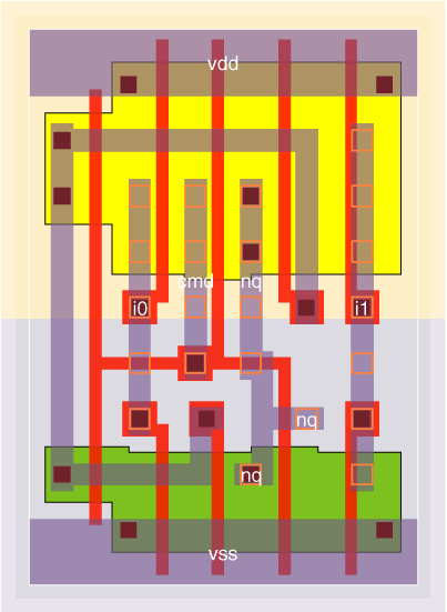 The nmx2_x1 is a single stage inverting mux with a P/N ratio of 1.7. The control signal cmd can be 1 or 2 delay stages with a stage effort of about 2. The nmx2_x4 is a 3 stage inverting mux with stage efforts of about 1.7 and 3.9. The control signal cmd can have 3 or 4 stages with stage efforts of about 1, 1.7 and 3.9. |