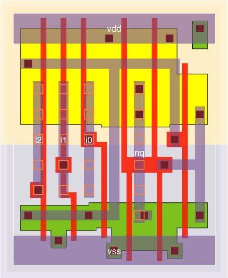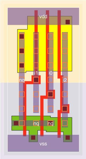 The no3_x1 is a single stage 3-NOR with P/N ratio of 1.5. The no3_x4 is a 3 stage 3-NOR with stage efforts of about 1.2 and 3.9.